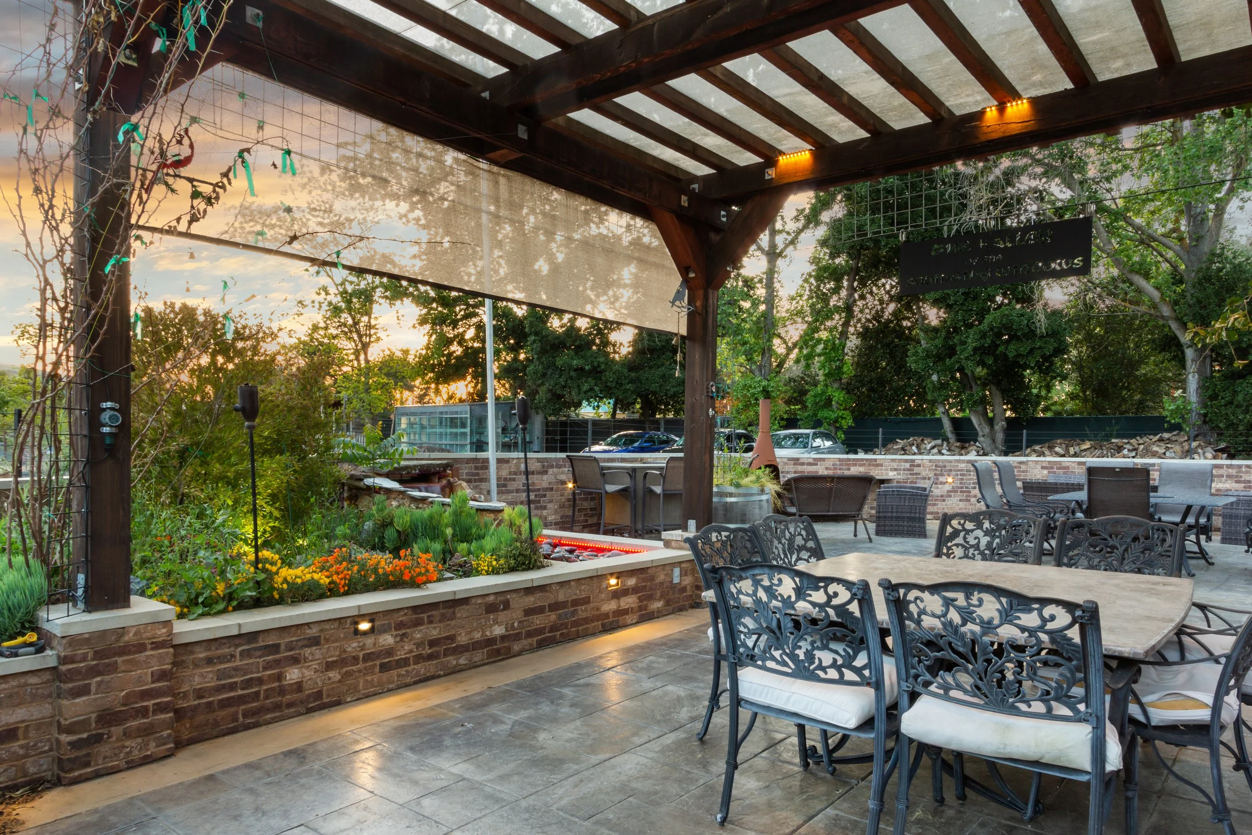 Front of property split w/a beautiful seasonal Creek. Covered pergola w/soft down lights & sunshade